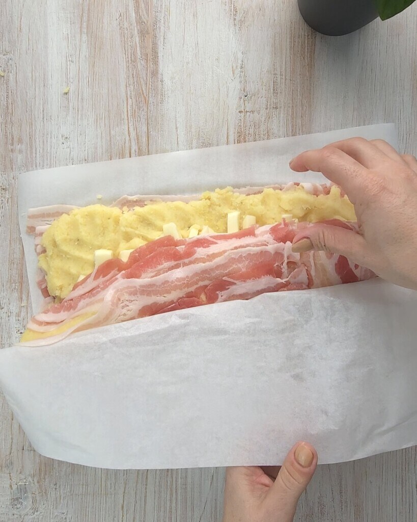 Neem het aardappelmengsel en druk het bovenop de plakken spek, zodat het een rechthoekige vorm krijgt.