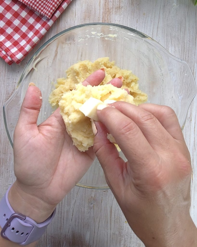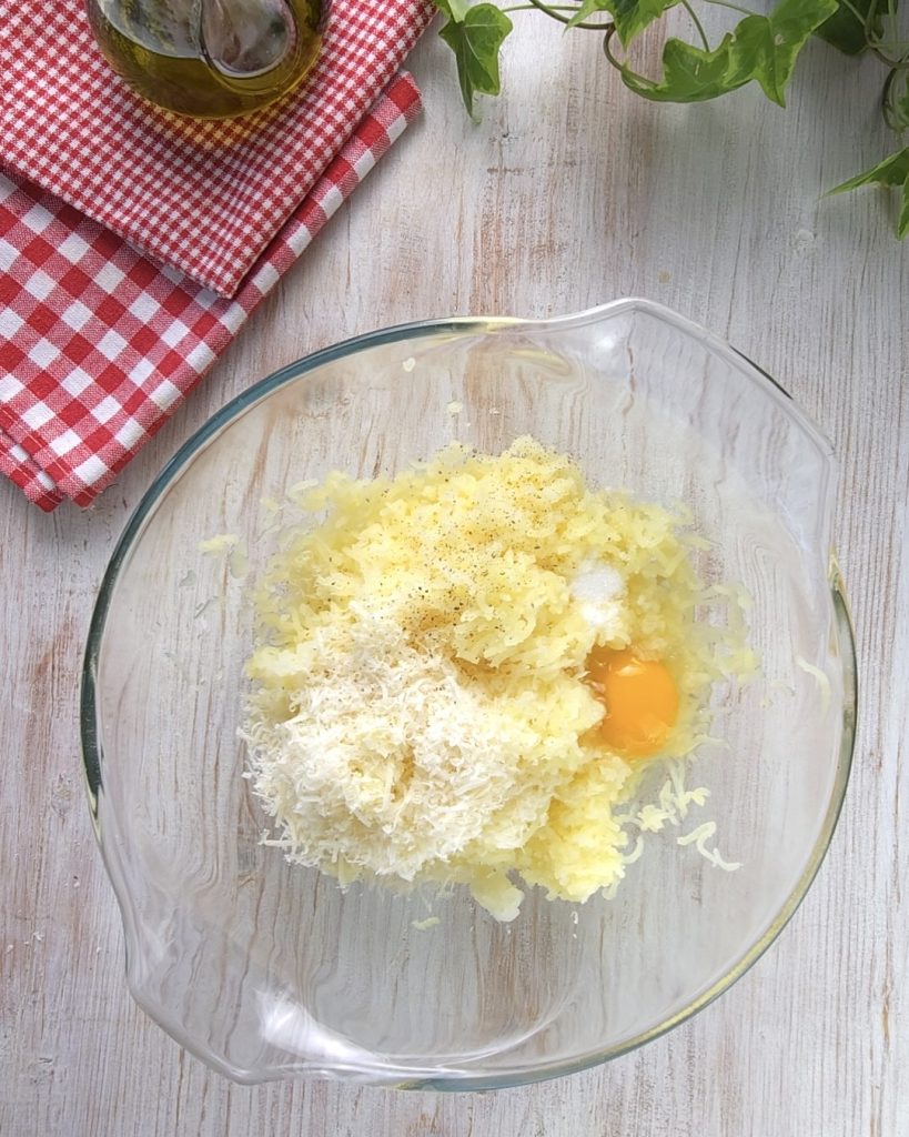 Kook eerst de aardappelen in ruim gezouten water gedurende ongeveer 40-45 minuten, afhankelijk van de grootte van de aardappel. Plet ze met een aardappelstamper en doe ze in een kom om af te koelen, voeg dan zout en peper toe, en vervolgens het ei en de geraspte Parmezaanse kaas.