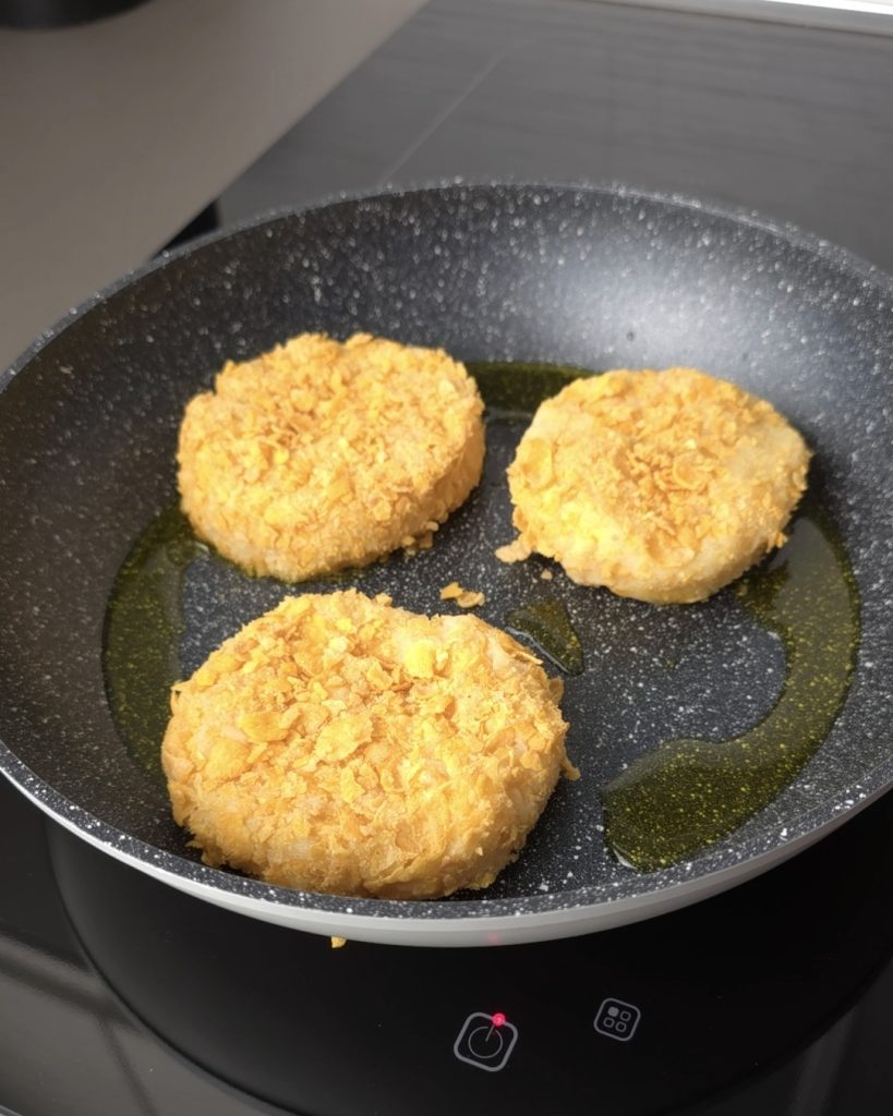 Rol de kroketten vervolgens in de grof gemalen cornflakes en zorg ervoor dat de panering goed hecht. Bak ze in een pan met een beetje olijfolie.