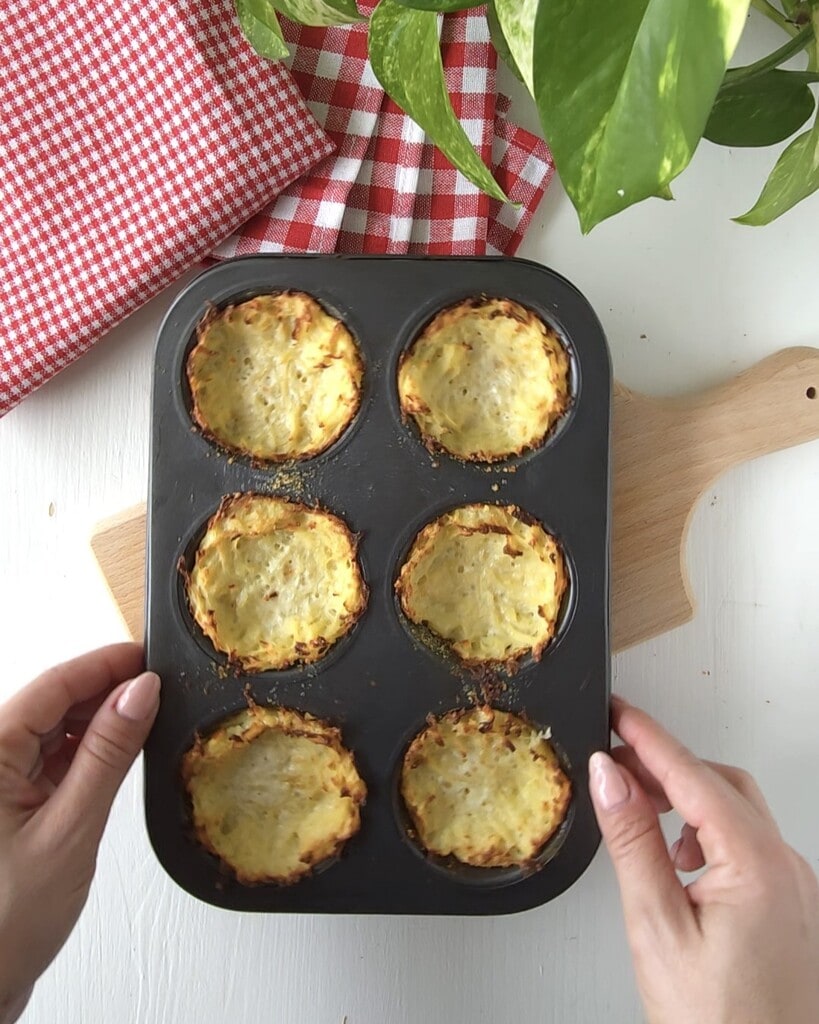 De aardappelmandjes kunnen worden bewaard in een luchtdichte container tot de volgende dag. Verwarm ze in de magnetron of oven en vul ze dan naar wens, bijvoorbeeld met zalm en stracciatella. Een uitstekende vegetarische optie zou zijn om de mandjes te vullen met gegrilde groenten.