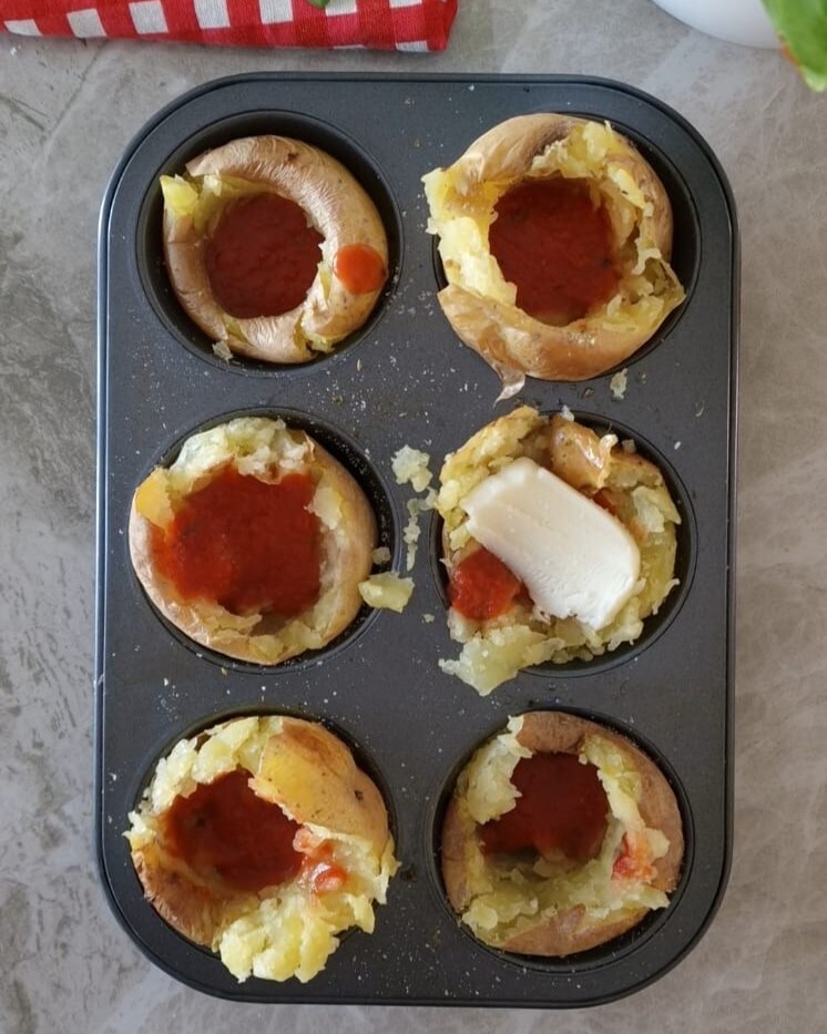 Begin met het goed wassen van de aardappelen, plaats ze vervolgens in de lichtjes geoliede muffinvorm.