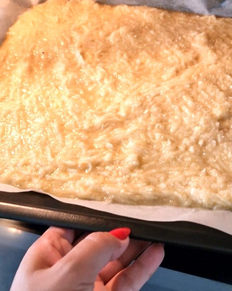 Haal het uit de oven en zonder het te laten afkoelen, vul het oppervlak met Philadelphia kaas, rucola en speck.