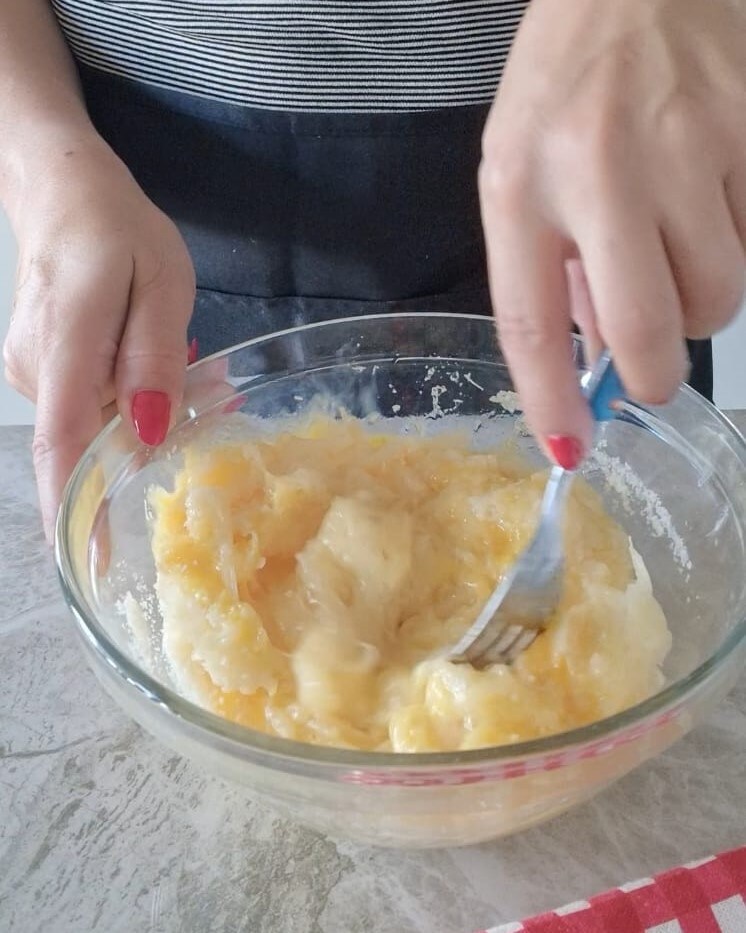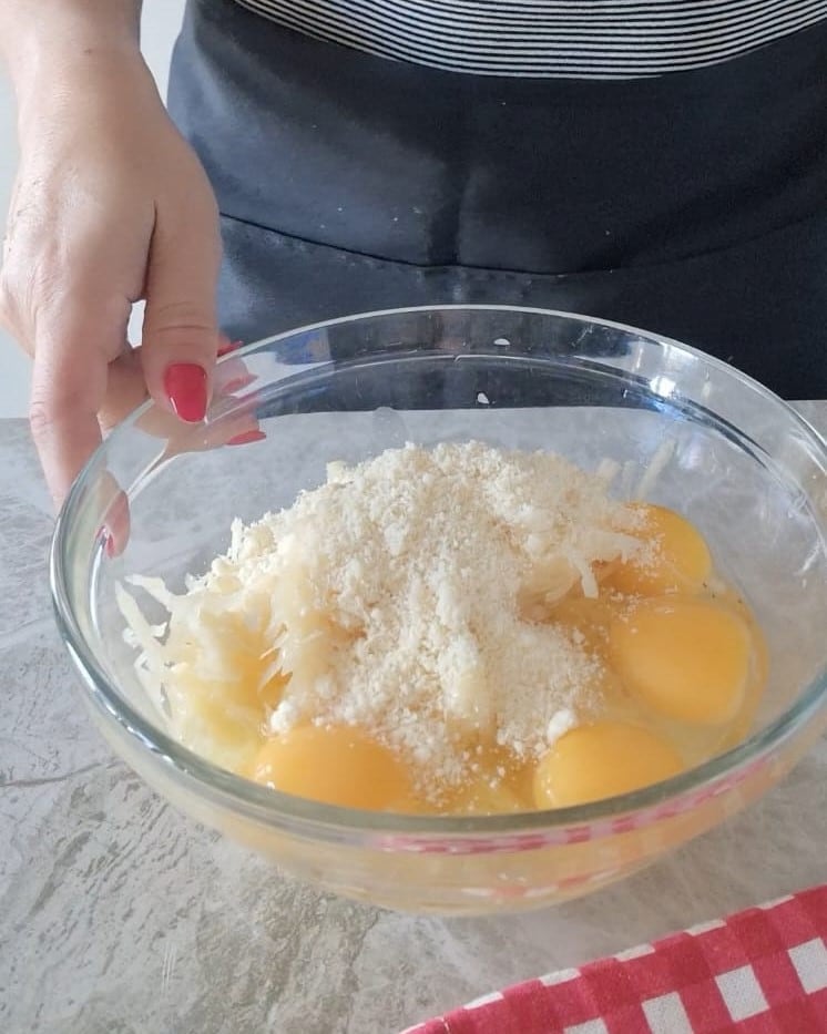 Kneus ze een beetje en verplaats ze dan naar een kom, voeg daarna het ei, de Parmezaanse kaas en het zout toe.