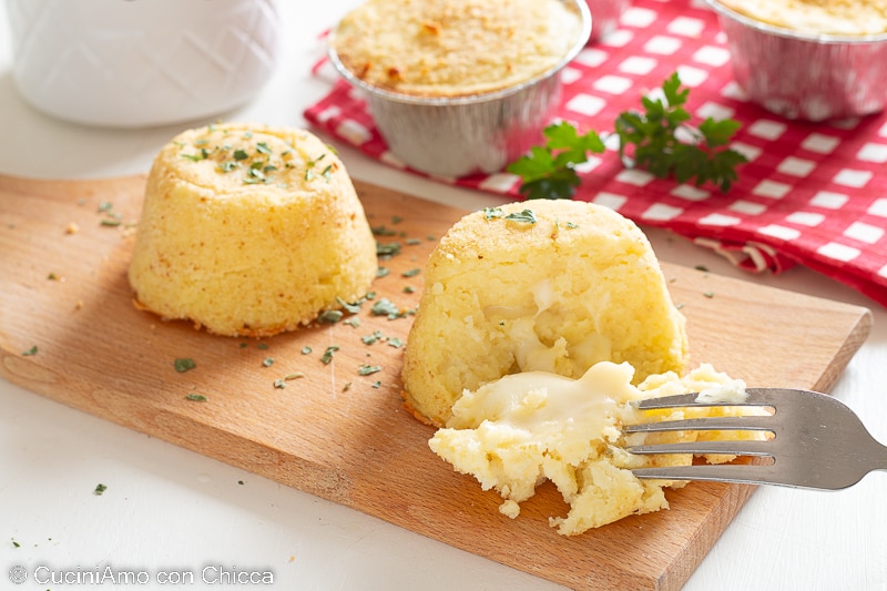 Aardappeltaartjes met een smeltend hart zijn een smakelijke tweede gang, eenvoudig en te maken met weinig en eenvoudige ingrediënten. Ze kunnen worden geserveerd met smakelijke gegratineerde wortelen uit de oven, of met heerlijke gegratineerde venkel. Het is een aardappelgratin, een kleine smakelijke schatkist, een zacht deeg op basis van aardappelen, eieren en met een smeltend hart, ik gebruik scamorza, maar als je wilt, kun je het vervangen door Galbanino, provola of Gorgonzola.