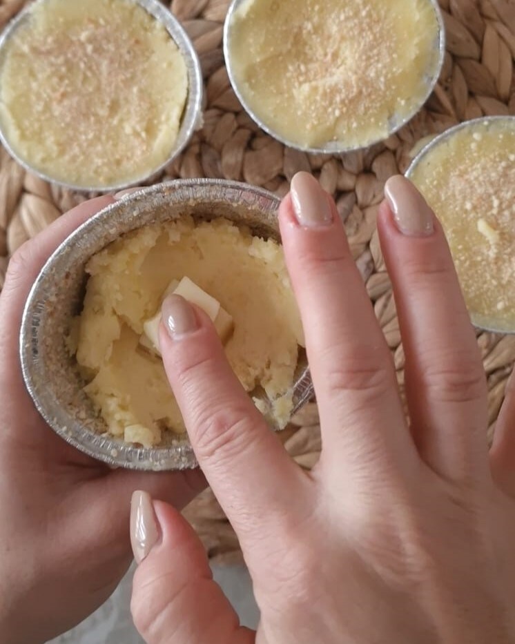 Vul de vormpjes om de taartjes te vormen: schep het mengsel beetje bij beetje met een theelepeltje in de vormpjes en druk het aan met de achterkant van de lepel.