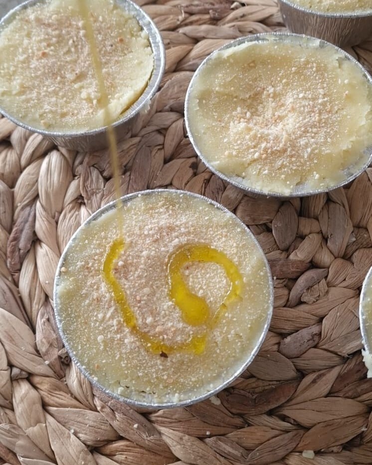 Zodra je een homogeen mengsel hebt verkregen, vet de vormpjes in en bestrooi ze vervolgens met paneermeel.