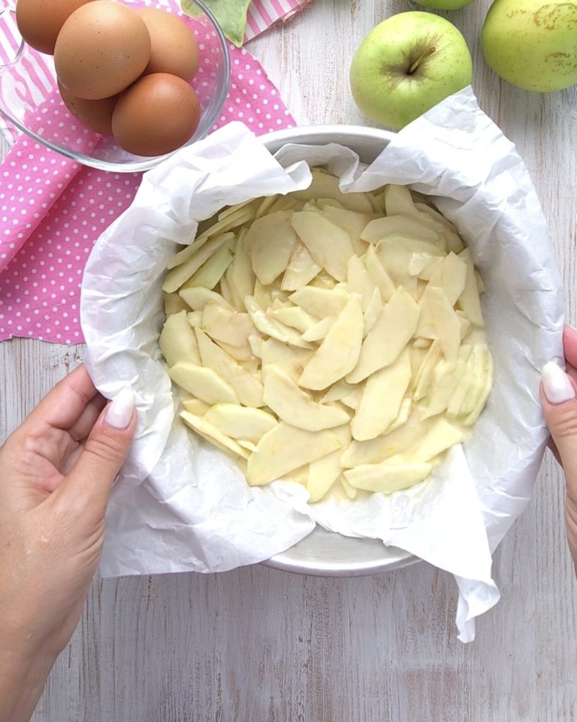 Schil eerst de appels en snijd ze in zeer dunne plakjes.