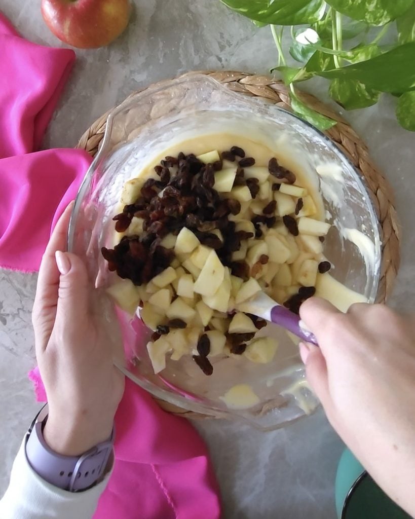 • Ten slotte voeg je 2 appels, in blokjes gesneden, de goed uitgeknepen rozijnen toe en meng goed.