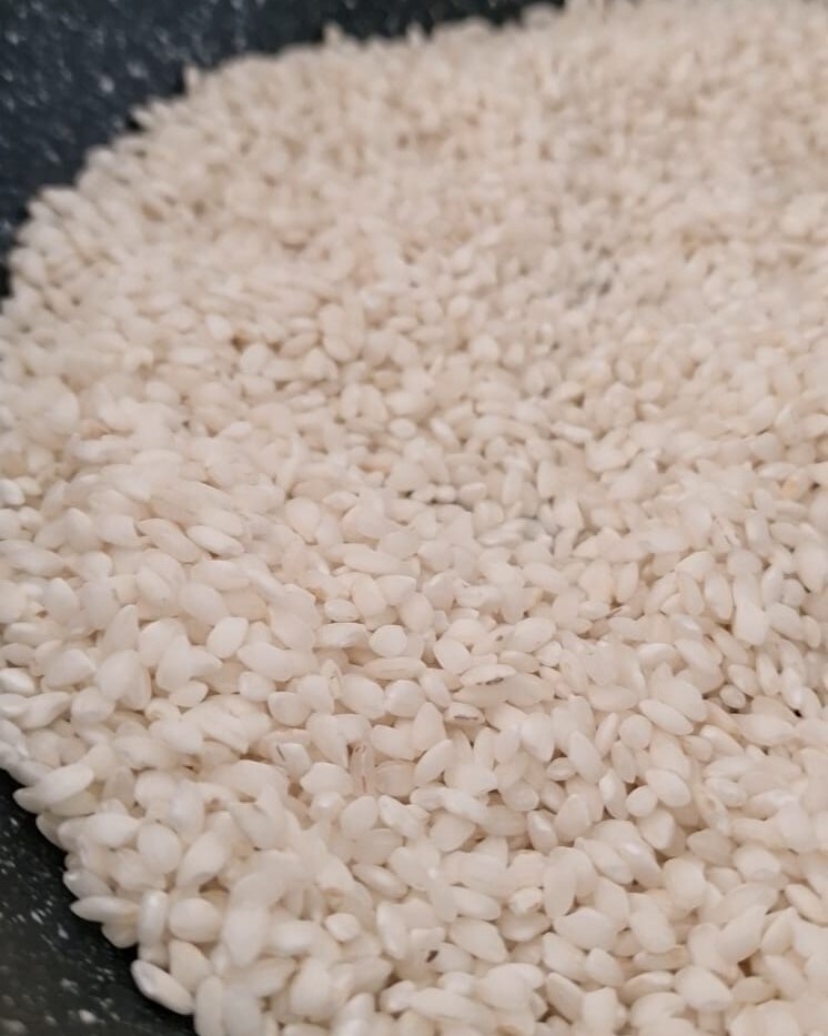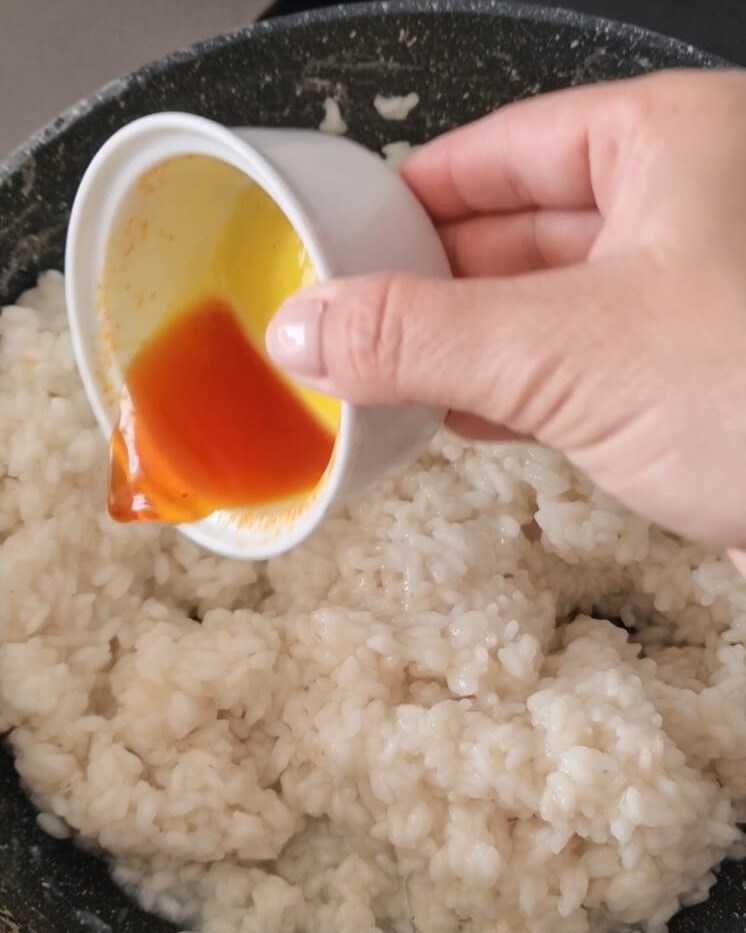Voeg aan het einde van het koken de saffraan toe opgelost in een beetje bouillon, voeg daarna de boter, Parmezaanse kaas, een snufje zout en peper toe en meng.