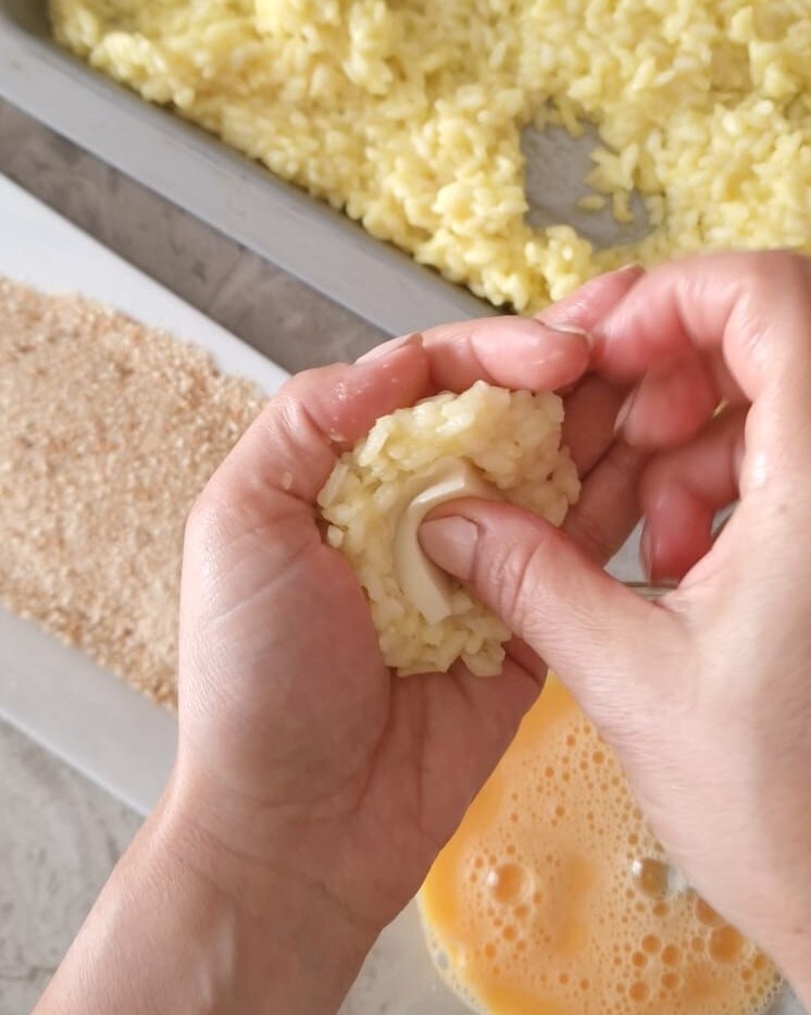 Na de afkoeltijd verdeel je de rijst in ongeveer 12 porties, neem er een, plat het iets af met natte handen, geef het de vorm van een arancina en vul het midden met de kaas.