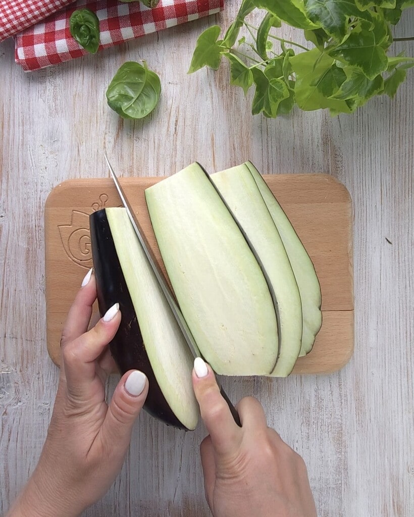 Snijd eerst de aubergines in niet te dikke plakken, leg ze vervolgens in een bakplaat bedekt met bakpapier. Maak lichte kruisvormige sneden bovenop de plakken.