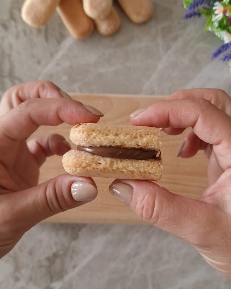 • Neem de twee helften van het koekje en vul ze met Nutella. Plaats ze vervolgens in een met bakpapier beklede bakvorm van 18-20 cm.
