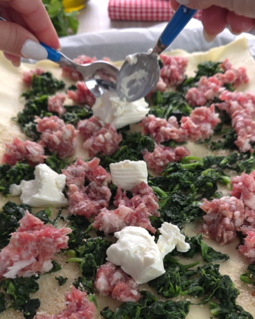 Vul nu met de spinazie en de worst, voeg ook de stracchino toe.