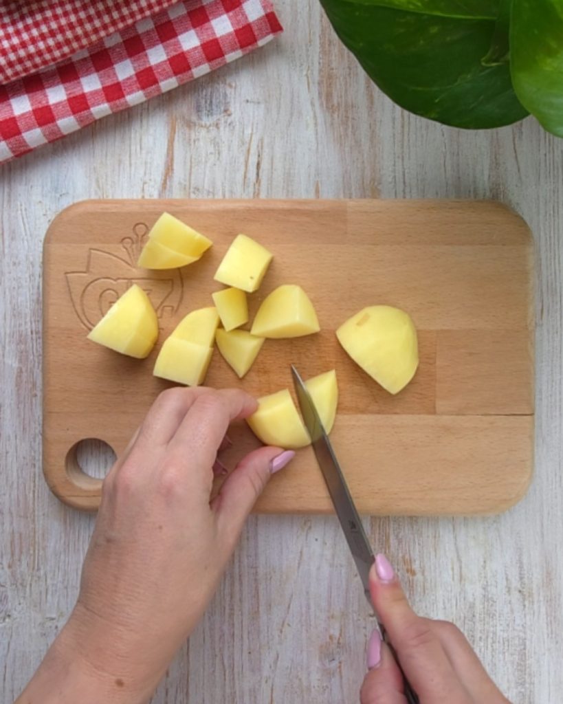 Schil de aardappelen en snijd ze vervolgens in middelgrote, gelijkmatige blokjes (voor een gelijkmatige bereiding).