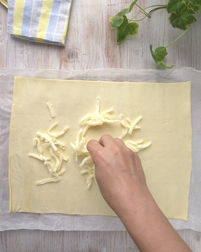 • Rol een rol bladerdeeg uit, vul vervolgens het gehele oppervlak met geraspte kaas.