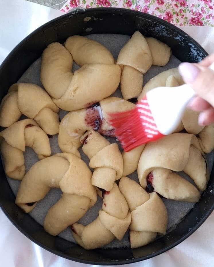 Bestrijk met melk en laat 20 minuten rijzen. Bak in de statische modus van de oven op 180°C gedurende ongeveer 25-30 minuten.