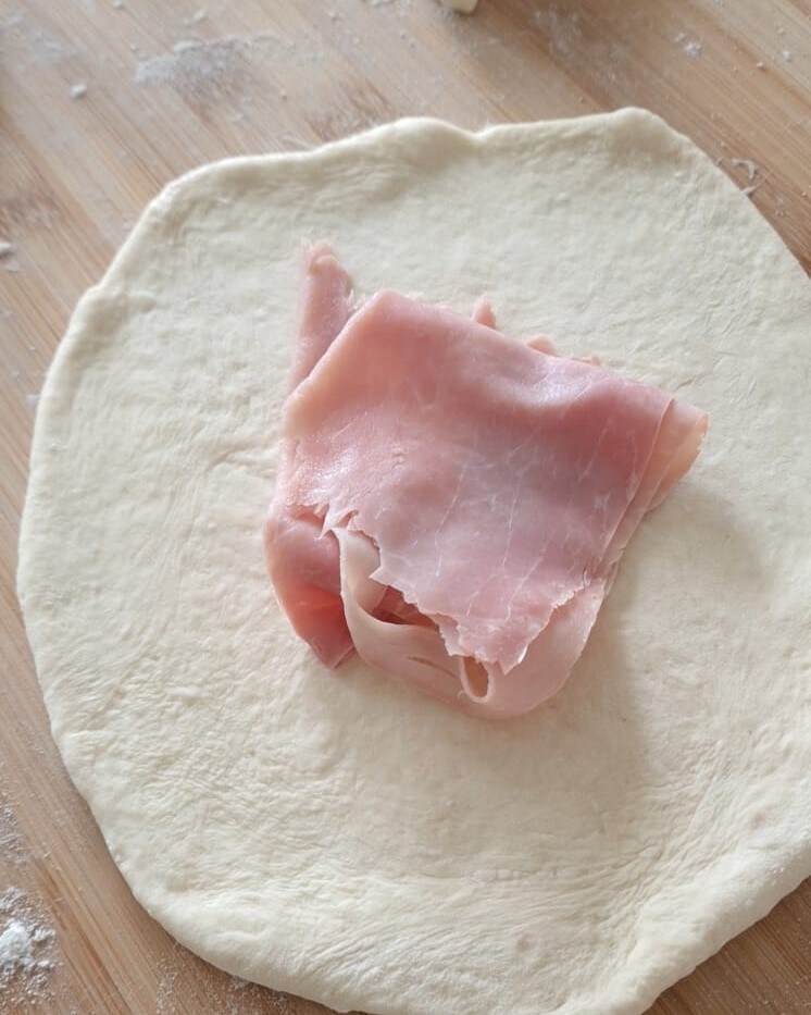 Na de rijstijd het deeg op een met bloem bestoven werkblad leggen en in 7 stukken verdelen. Rol elk balletje uit met een deegroller en voeg dan de gekookte ham en de in plakjes gesneden kaas toe.