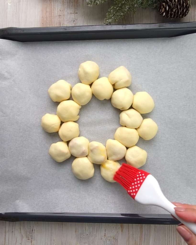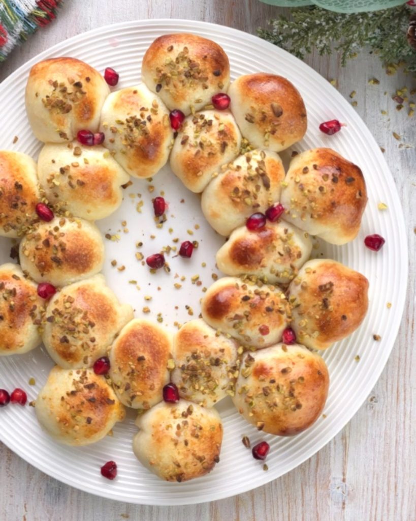 • Leg een vel bakpapier op een bakplaat, plaats een schaaltje in het midden en maak de krans met de balletjes. Bestrijk met losgeklopt ei en een beetje melk en garneer met pistachenootjes. Bak op 190°C gedurende ongeveer 12-15 minuten of tot ze goudbruin zijn.