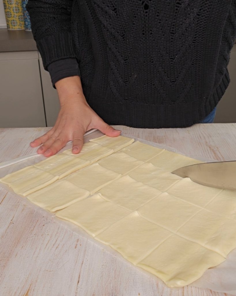 • Rol het kant-en-klare deeg uit en verdeel het in vierkanten.