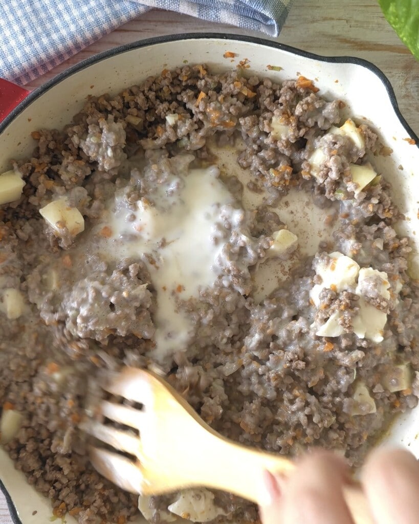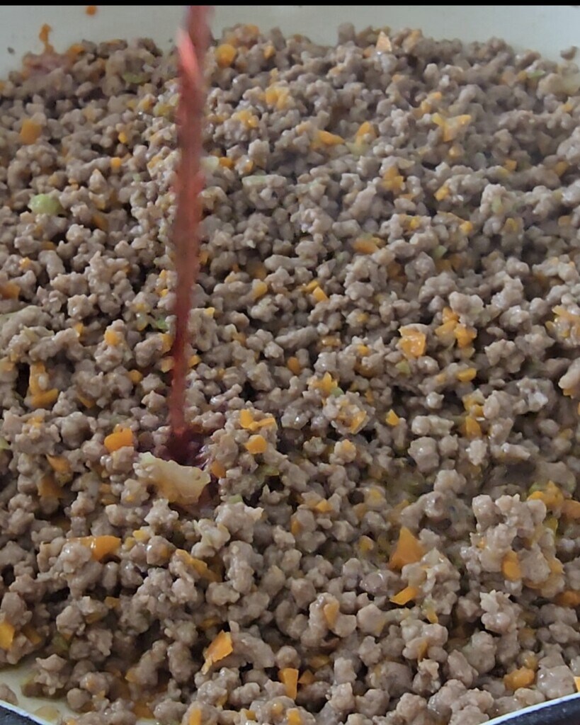 Voeg het gehakt toe en bak het ongeveer 10 minuten, voeg daarna zout en peper toe.