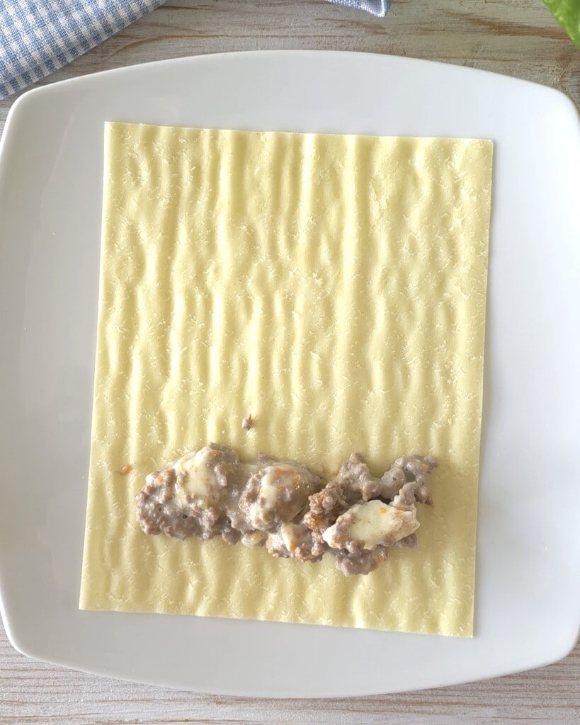 Rol het deeg vervolgens op om cilinders te vormen. Verspreid een paar eetlepels bechamelsaus op de bodem van een ovenschaal en plaats je cannelloni.