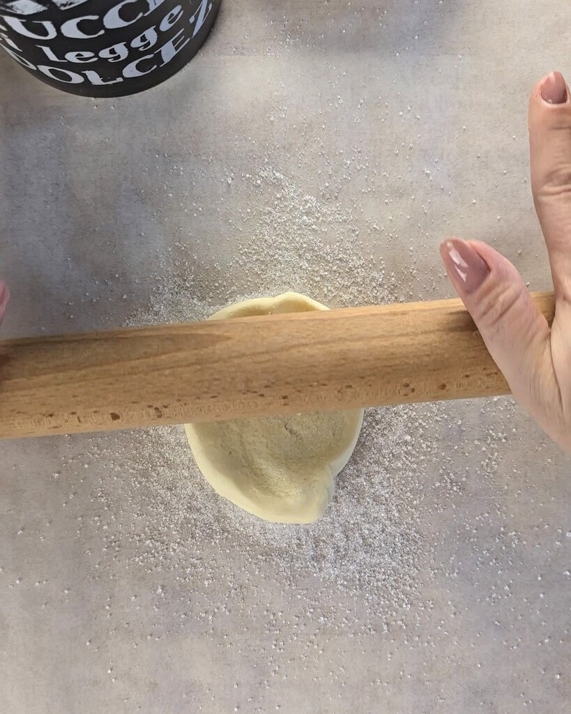 • Bestrooi het werkvlak met suiker, rol vervolgens een rolletje uit met de deegroller zodat de suiker blijft kleven.