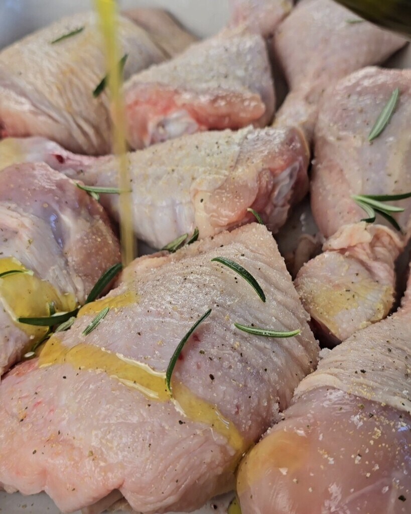 Breng de kip op smaak met olie, citroensap en plakjes, laat het vervolgens ongeveer een uur marineren.