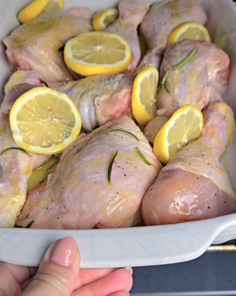 Neem de kippenpoten en breng ze op smaak met zout, peper en knoflookpoeder, snijd vervolgens de citroen in plakjes.