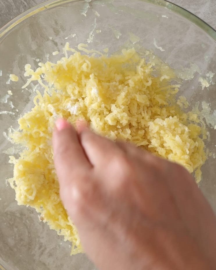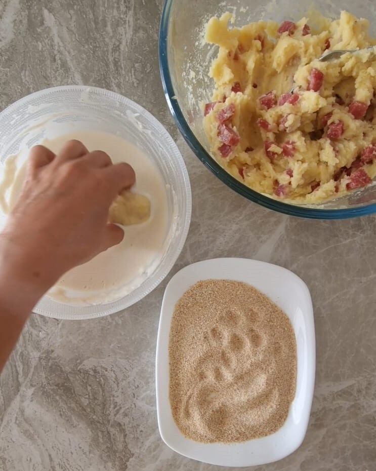 Neem met je handen een beetje van het mengsel, plaats een stuk kaas in het midden en sluit het in het mengsel door een ovale bal te vormen.