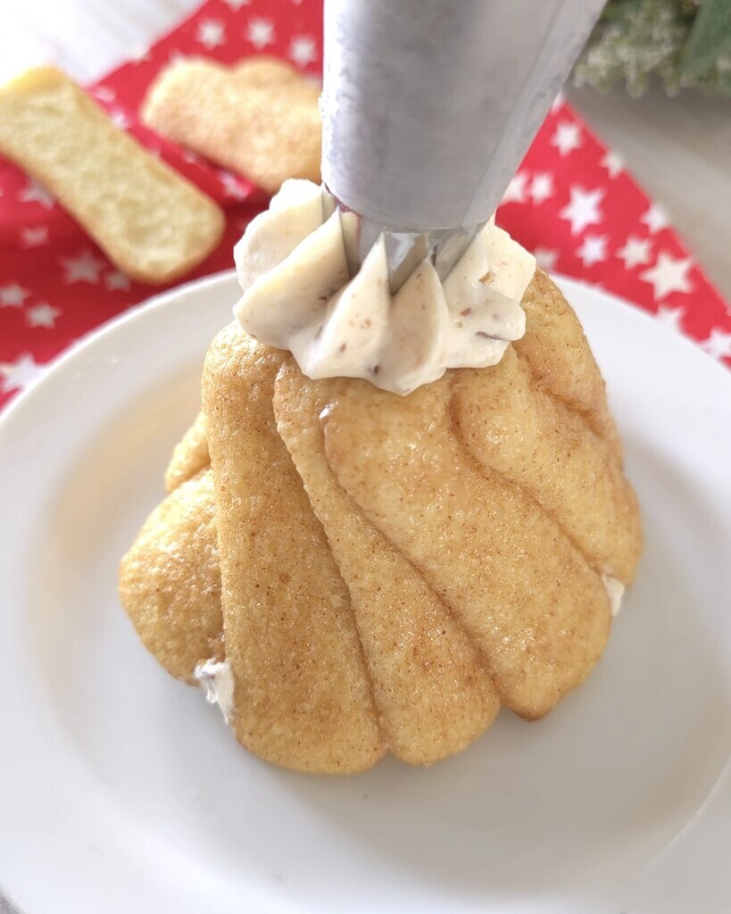 Als laatste stap, versier met de mascarponecrème door toefjes te maken met behulp van een spuitzak, versier met de overgebleven nougat en gesmolten chocolade.