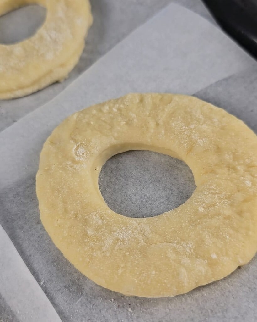 Na de rusttijd, rol een schijf van ongeveer 3 cm dik met een steker en snijd rondjes uit, maak een gaatje in het midden met een spuitmondje van een spuitzak of een flesdop.