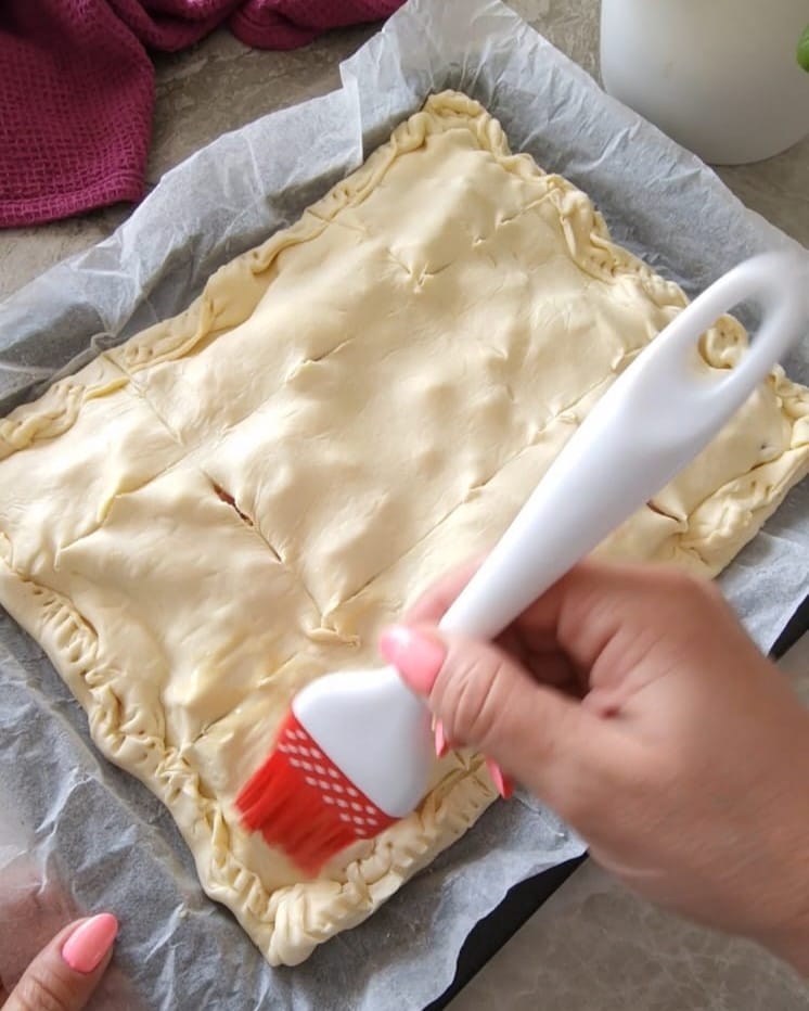 Bedek met de tweede rol bladerdeeg, maak rechthoekige sneden en bestrijk vervolgens het deeg met het licht geklopte ei.