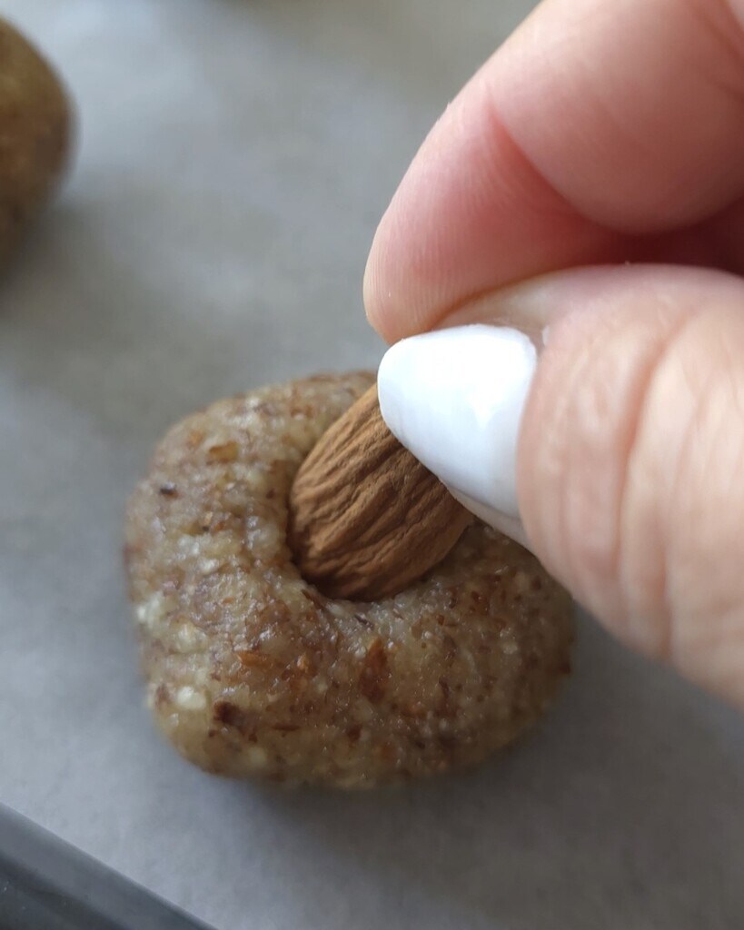 • Vorm van het verkregen mengsel veel balletjes van ongeveer 20 g elk. Leg alle balletjes op gelijke afstand van elkaar op een bakplaat bedekt met bakpapier.