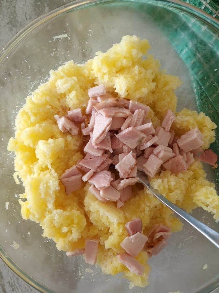 Na de kooktijd, pureer ze met een aardappelstamper, voeg de geraspte Parmezaanse kaas, zout en in blokjes gesneden gekookte ham toe.