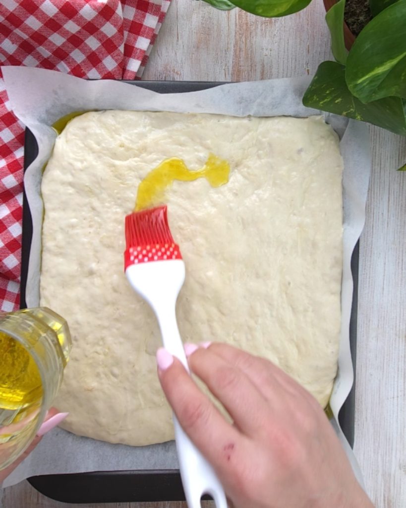 • Op dit punt leg je het deeg op een goed ingevette bakplaat van 15×30 cm, spreid het uit met je handen en laat 2 uur rijzen.