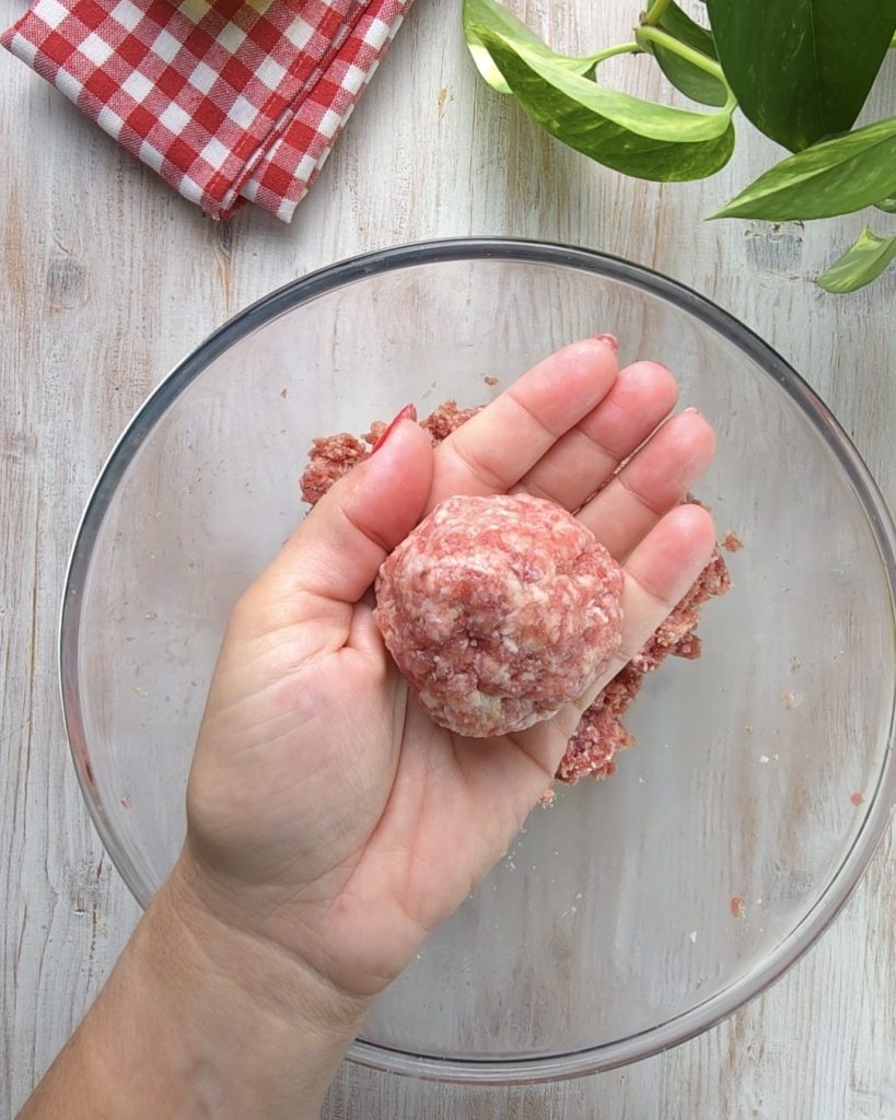 Kneed goed met de handen tot alle ingrediënten goed gemengd zijn en vorm dan met de handen de gehaktballetjes en zet apart.