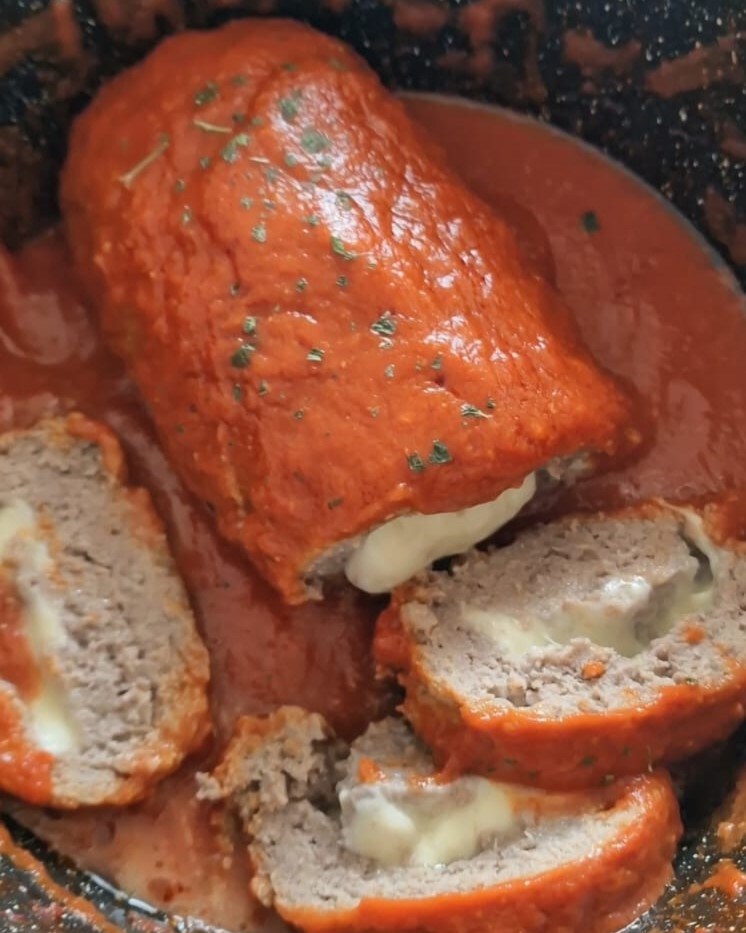 Het gehaktbrood in saus kan tot twee dagen in de koelkast worden bewaard in een luchtdichte container. Je kunt het ’s ochtends bereiden, het in de koelkast bewaren en op het moment zelf koken. In plaats van scamorza kun je andere kazen zoals Galbanino of provola gebruiken.