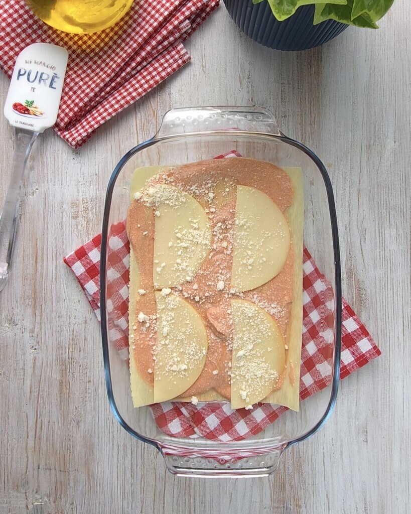 Leg een beetje saus op de bodem, gevolgd door een laag verse pasta, de gerookte scamorza in plakjes en de geraspte Parmezaanse kaas.