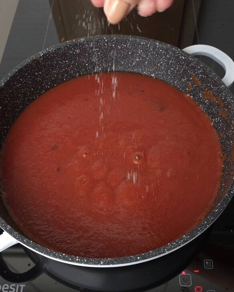Voeg de tomatenpuree toe en laat 10 minuten koken, zout en peper naar smaak.