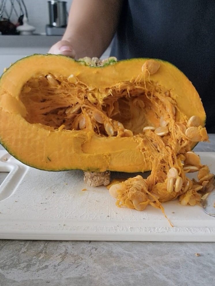 Allereerst moet je de pompoen in tweeën snijden, daarna moet je de zaden verwijderen met een lepel.