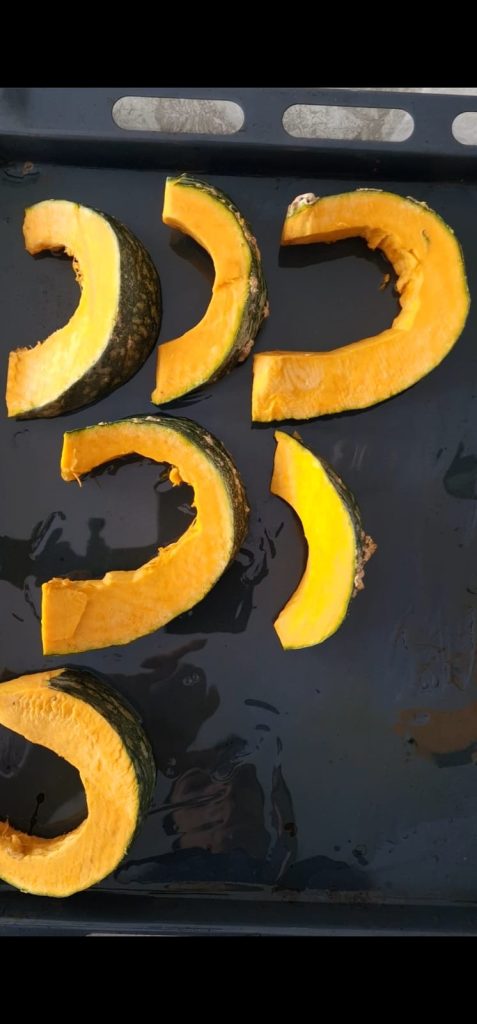 Bak in de statische modus van de oven op 180°C gedurende ongeveer 40 minuten of totdat de pompoen zacht is als je erin prikt met een vork.