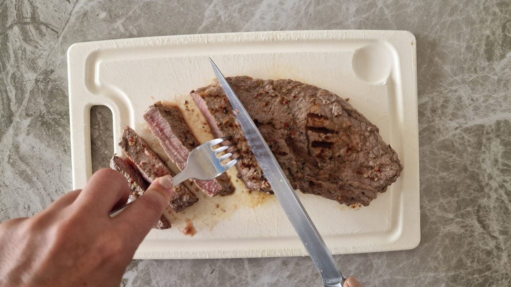 Bereid de grill voor en verhit deze op hoog vuur. Kook het vlees ongeveer 5-6 minuten voor medium gaarheid, afhankelijk van de dikte van het vlees; haal vervolgens het vlees eruit en laat het 5 minuten rusten.