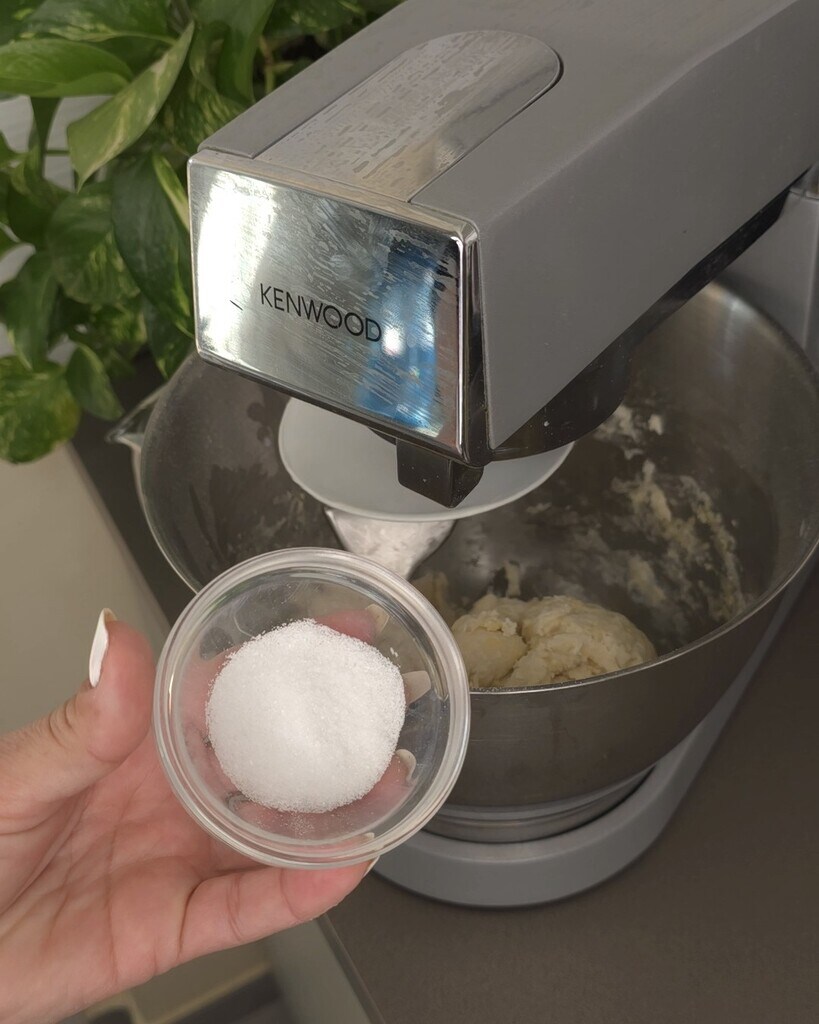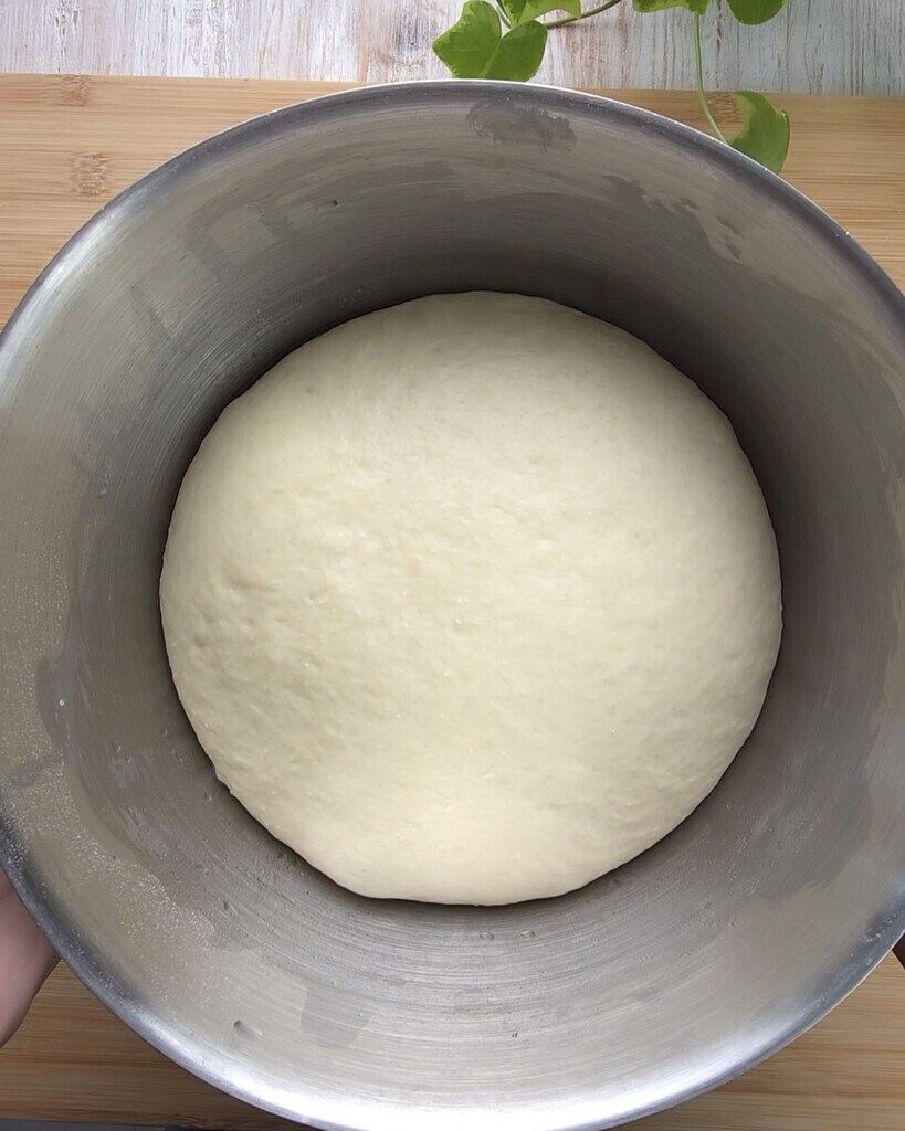 Kneed goed tot een deegbal en laat 2 uur rijzen tot verdubbeling in de uitgeschakelde oven met het lampje aan