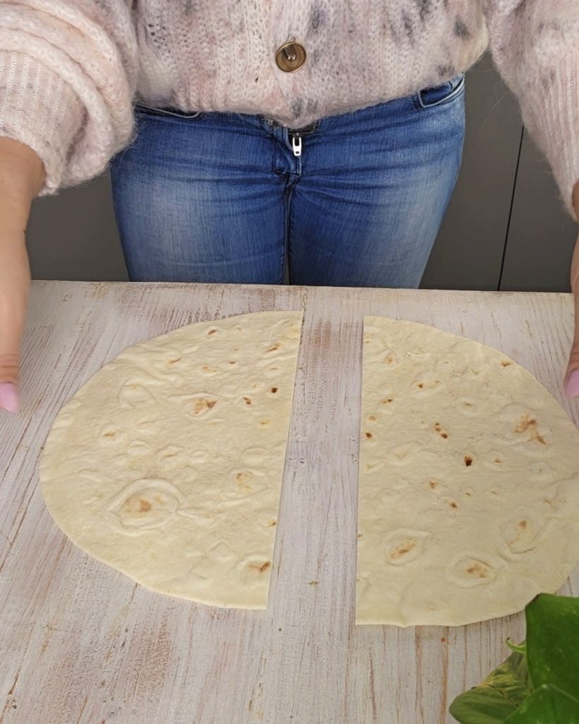 Neem de eerste piadina en verdeel deze in twee gelijke delen.