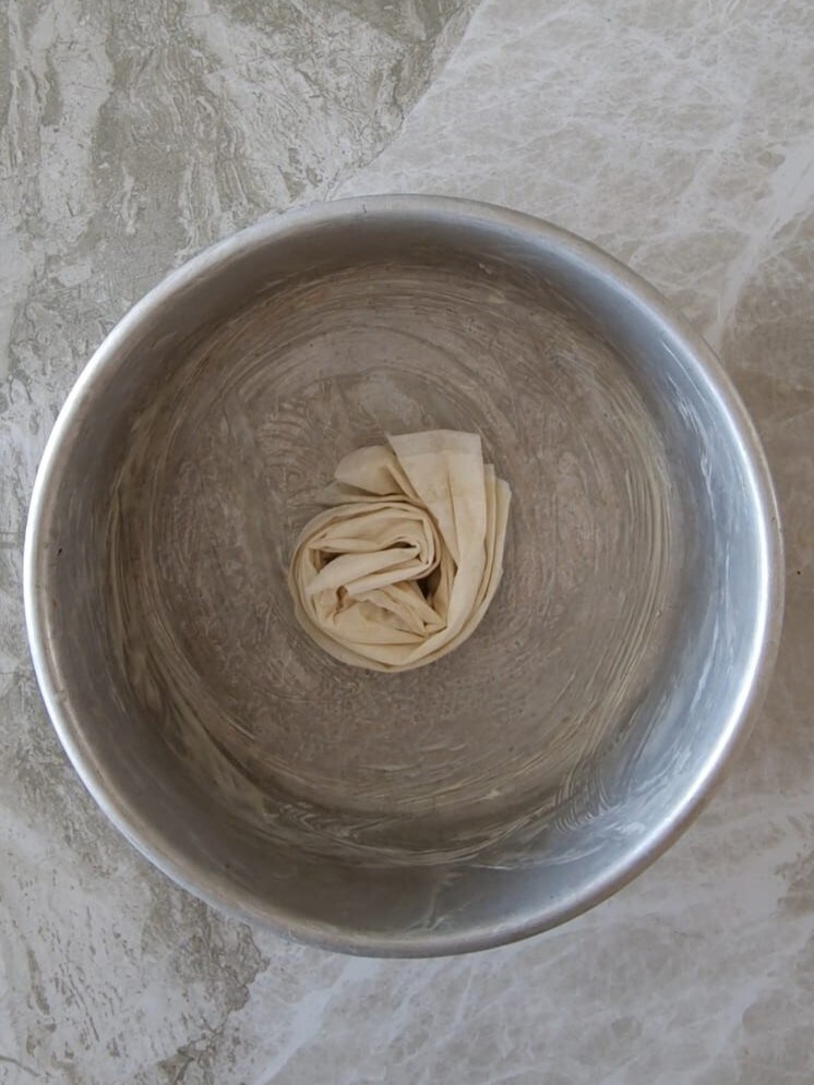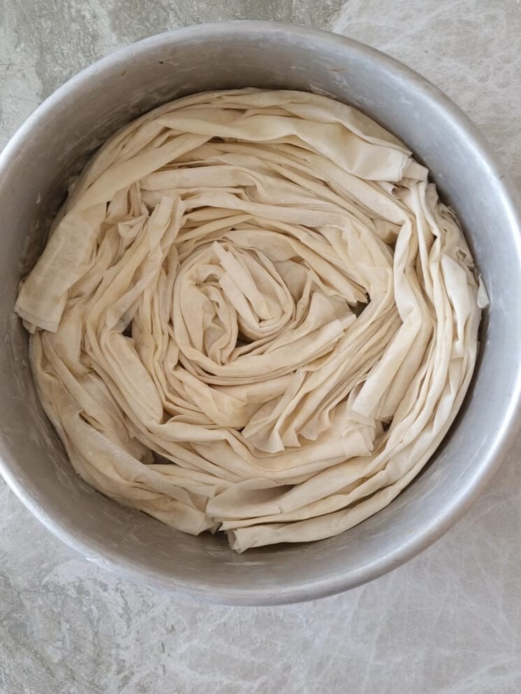 Filodeeg ontleent zijn naam aan het Griekse ‘phyllo’ dat ‘blad’ betekent, en bestaat voornamelijk uit bloem, water, olie en een snufje zout. De bal wordt bereid en laat 2 uur rusten, en vervolgens verdeeld in gelijke delen die worden uitgerold met een deegroller.