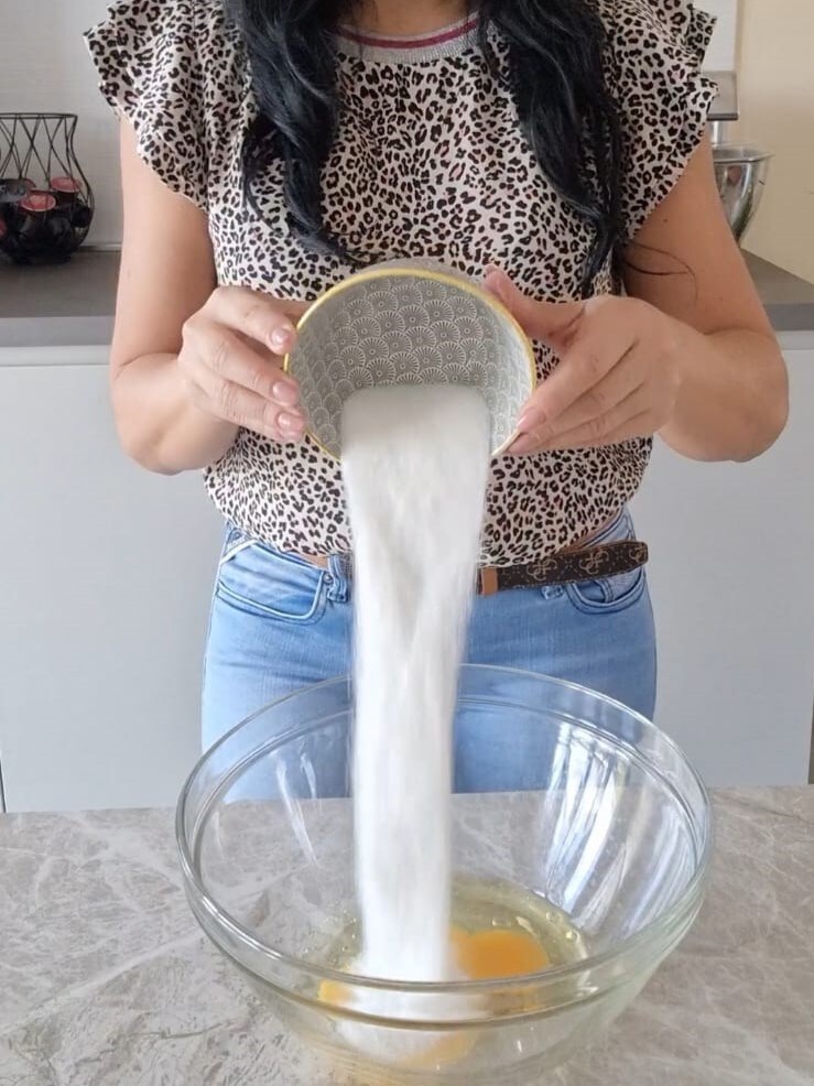 We beginnen eerst met de vloeibare ingrediënten: Doe de eieren, suiker, vanilline en room in een kom en meng met een garde.