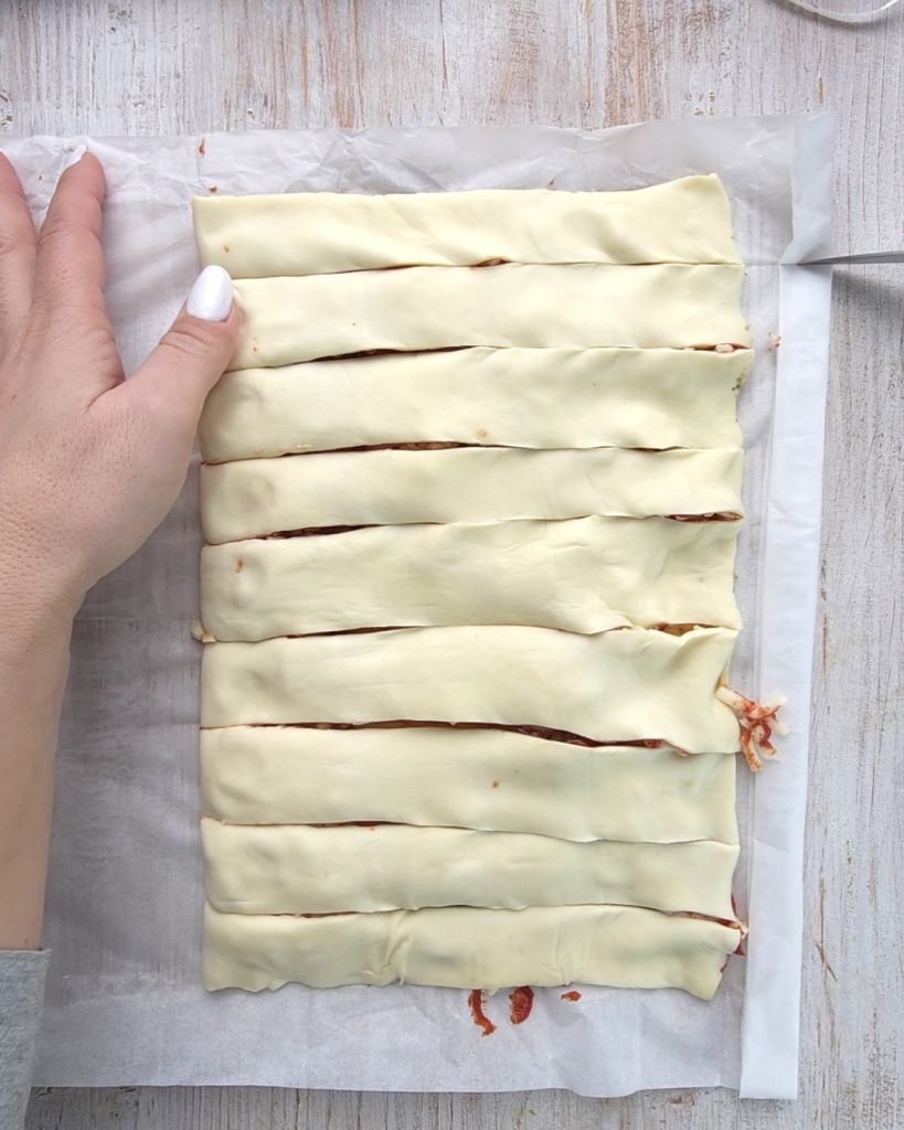 Begin met het uitrollen van het bladerdeeg, vul het vervolgens royaal met tomatenpuree, oregano en geraspte mozzarella.