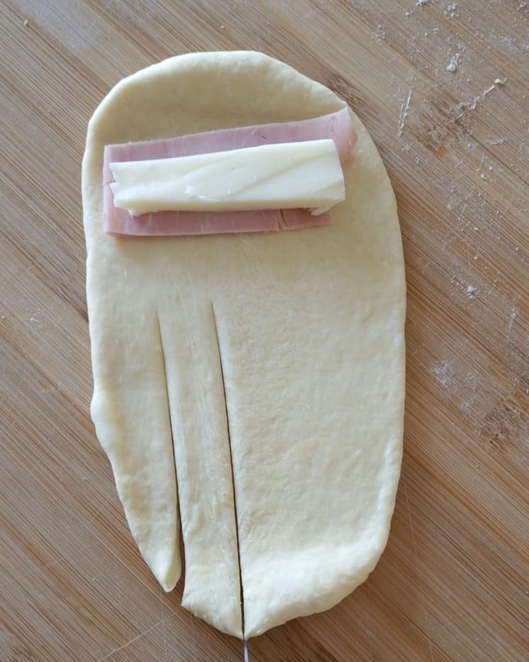 • Na de rusttijd verdeel je het deeg in 9 delen, rol ze uit met een deegroller en vul ze dan met ham en kaas, snijd vervolgens verticale inkepingen met een mes.