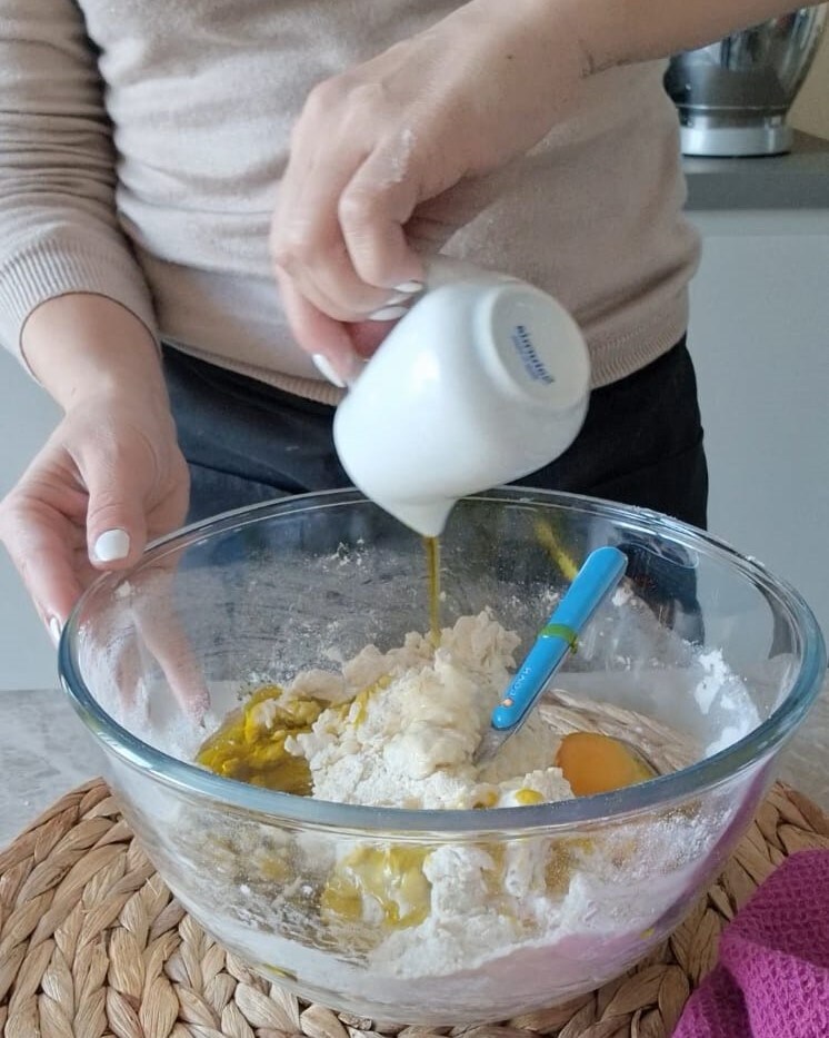 • Voeg vervolgens het water, de melk beetje bij beetje toe, daarna ook de olie en het zout.