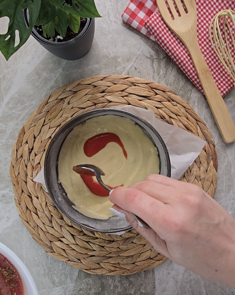 Giet de helft van het beslag in een met bakpapier beklede taartvorm van cm 22, of smeer en bestuif het alternatief met bloem. Ga verder door een laag tomatenpassata toe te voegen, die vooraf is gekruid met zout en oregano.
